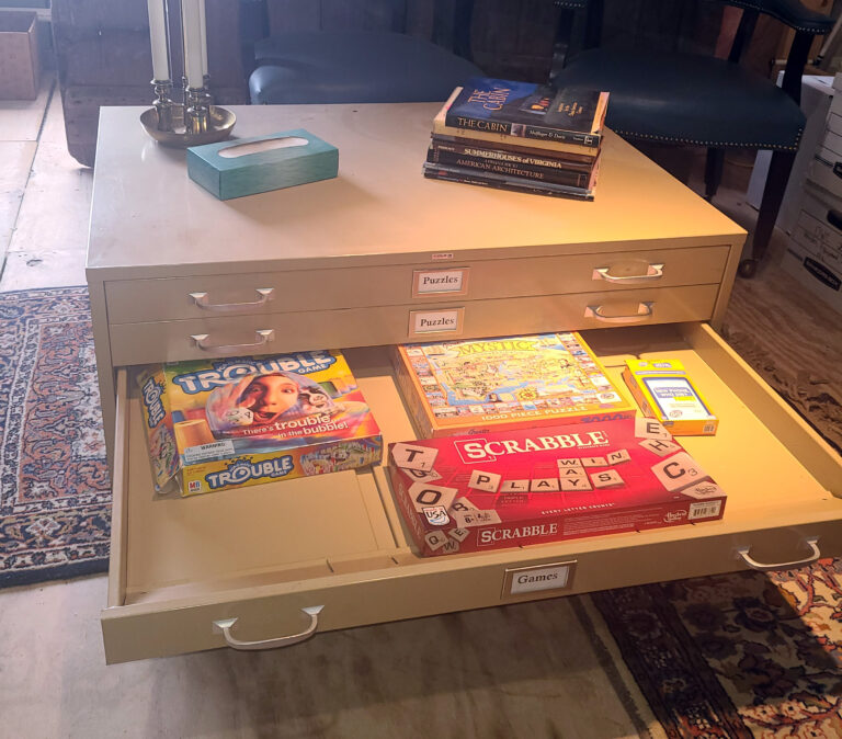 Light tan metal filing cabinet on casters. This coffee table style cabinet stores architectural drawings, puzzles and games, maps, magazines and much more. $500.00